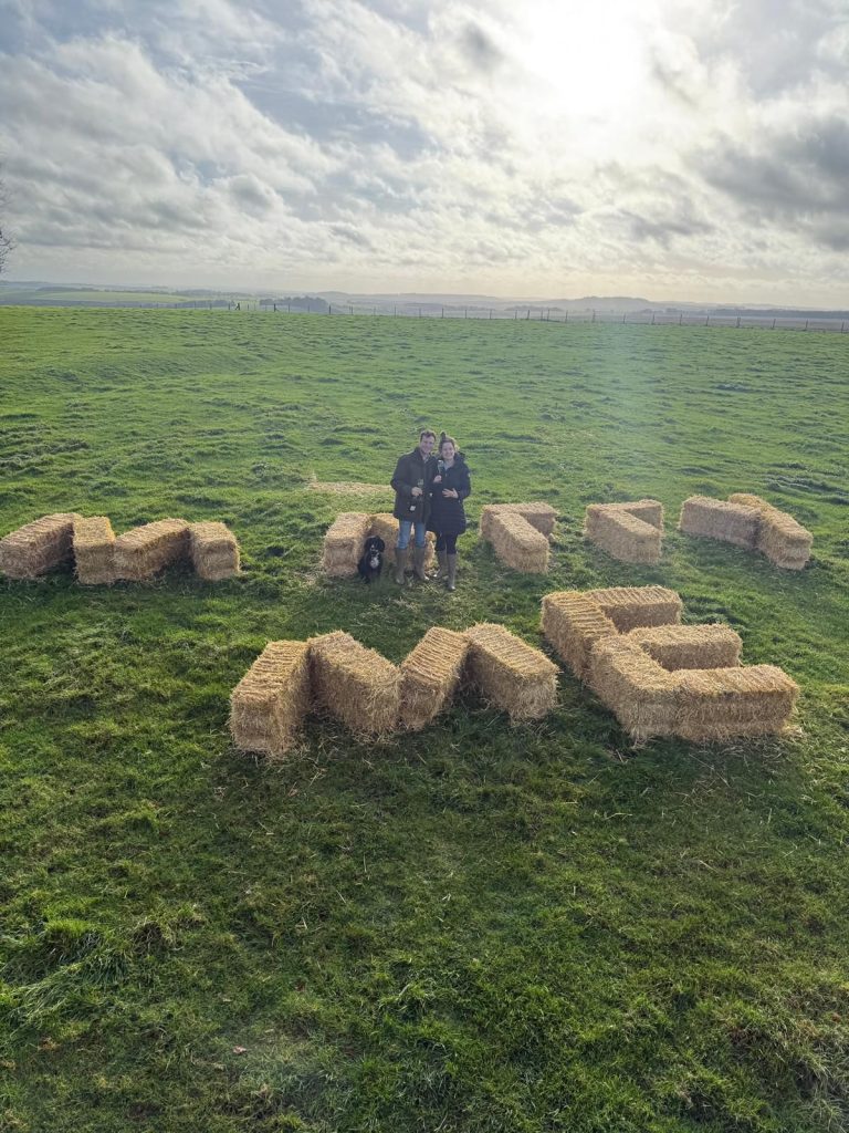 Ben spelled out “Marry me” with straw bales, in a field on his farm!